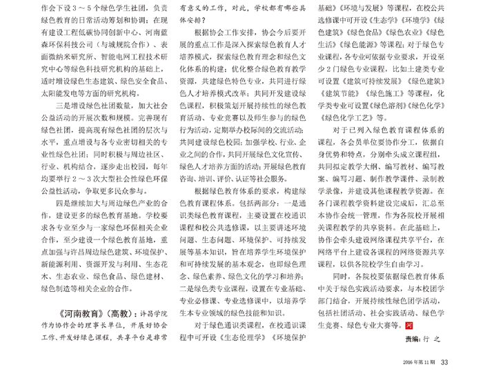 专题覆盖14个页码共计两万余字,内容包括应用技术大学(学院)联盟绿色教育专业协作会全景式综述、让绿色教育走进每个师生的内心——赵继红院长专访,还分别对bet36体育在线电气(机电)工程学院、新材料能源学院、城乡规划与园林学院、食品与生物工程学院的绿色教育特色工作进行了报道。