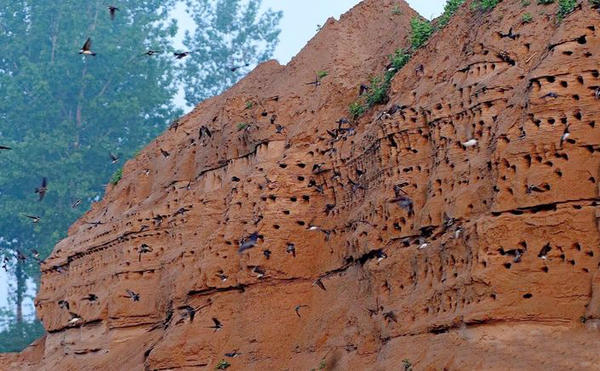 崖沙燕因喜欢在沙土崖壁上筑巢而得名,又被称“崖壁建筑师”。 许昌环保人士赵宏冉介绍,崖沙燕通常营巢于河流或湖泊岸边沙质悬崖上,由雌雄成鸟轮流在沙质悬崖峭壁上用嘴凿洞为巢,巢呈水平坑道状,深度为0.5米到1.3米。