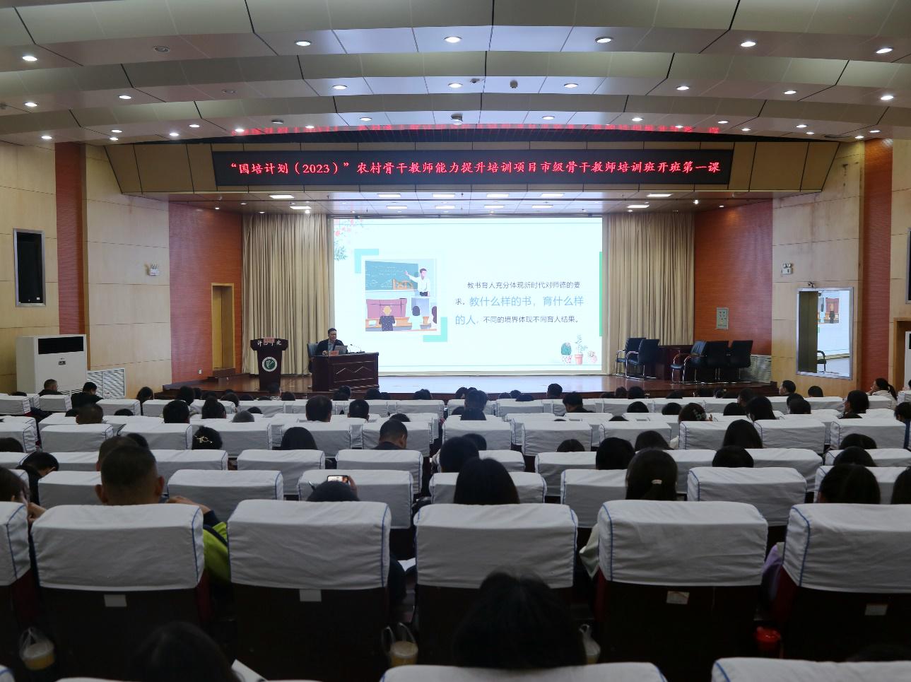 自今年9月份“国培计划(2023)”开展以来,bet36体育在线紧密结合培训项目实际,创新活动方式、方法,以“专家讲座”“榜样示范”“现场观摩”等形式为学员扎实开展“开班第一课”活动。10月8日,首届河南省教书育人楷模、许昌市襄城县文昌小学校长刘忠伟也应邀走上该校市级骨干教师培训班的讲台,结合自身经历以及多年工作经验,以《教书育人,教师职业的恪守》为培训学员讲授“开班第一课”。