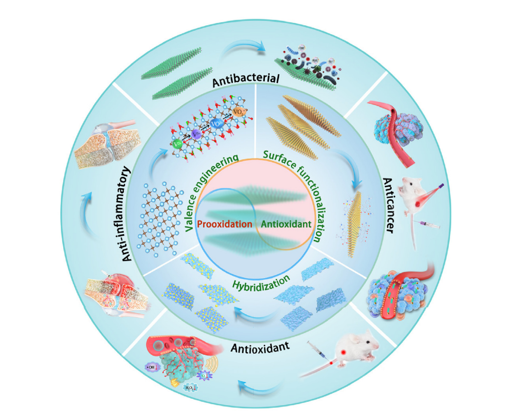 2D Mxenzymes作为生物医学治疗的新兴RONS调控剂示意图