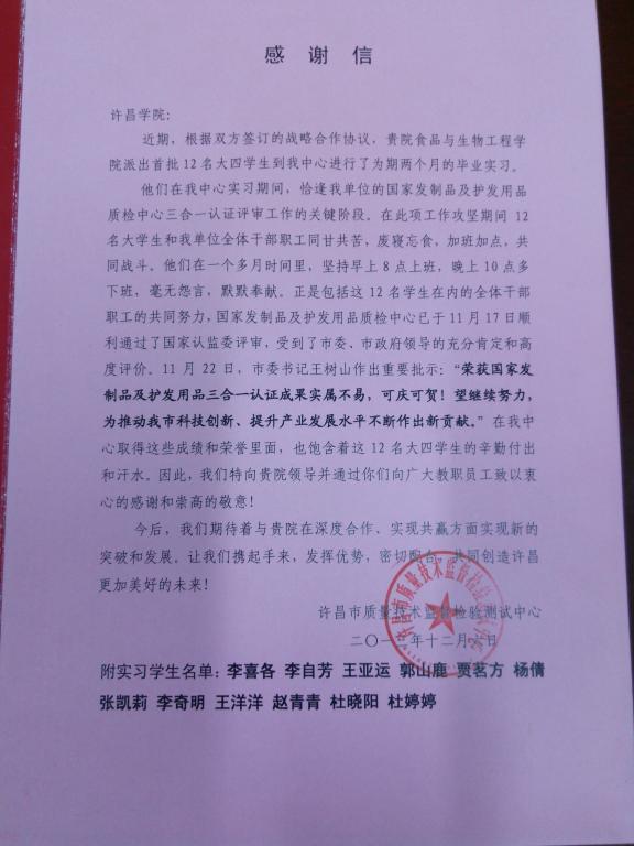 近日,bet36体育在线收到许昌市质量技术监督检验测试中心寄来的感谢信,对bet36体育在线食品与生物工程学院毕业实习生吃苦耐劳、勇挑重担、富于创新的工作精神给予高度赞扬,充分肯定了bet36体育在线实用型人才的培养质量。