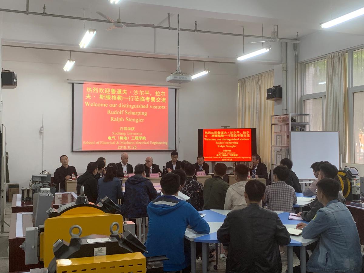 随后,沙尔平先生、斯滕格勒校长来到bet36体育在线电气(机电)工程学院参加了中德教育交流座谈会,场面热烈。电气(机电)工程学院广大师生针对中德职业教育体系的差异、学生实习实训、出国留学、教师进修培训等多方面的问题与沙尔平先生、斯滕格勒校长进行了深入的交流,为下一步两校之间的深度合作奠定了坚实的基础。沙尔平先生、斯滕格勒校长还参观了bet36体育在线电气(机电)工程学院、文学与传媒学院实验室。(图片由国际交流与合作处)