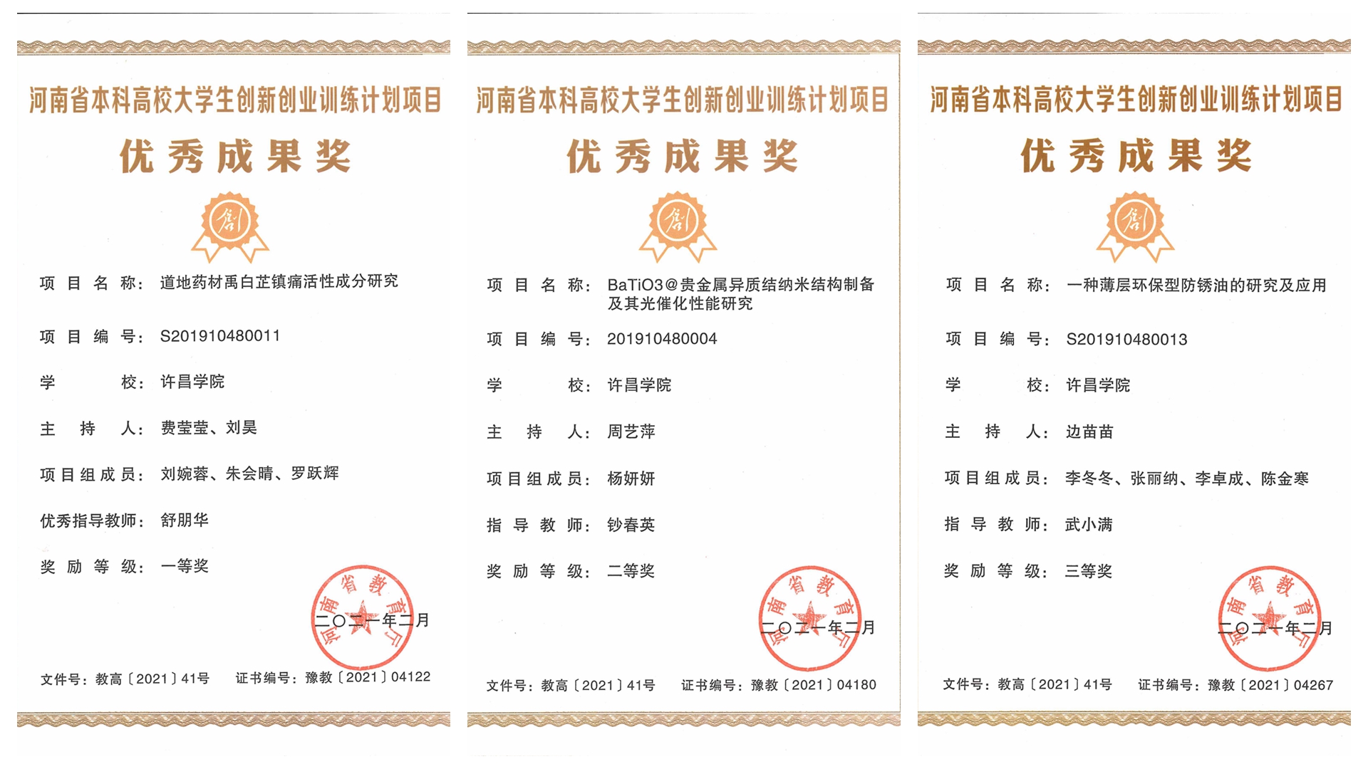 日前,河南省教育厅公布了2020年河南省本科高校大学生创新创业训练计划项目优秀成果奖评审结果,bet36体育在线3个本科生团队分获优秀成果一二三等奖。
