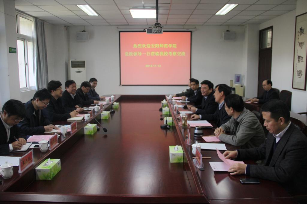 11月13日,在安阳师范学院党委书记郑邦山、院长赵卫东教授的带领下,安阳师范学院副院长姚远峰及党办、院办、发规办、教务处等有关部门负责人一行7人莅临bet36体育在线,调研bet36体育在线的转型发展情况。bet36体育在线党委书记王清义,副院长张建军、郑直等领导接待了安阳师范学院考察团一行。党办主任冯晓民、院办主任陈遂德、教务处副处长贾晓红等相关部门负责同志与来访客人进行了对口交流座谈。王清义书记主持考察交流座谈活动。