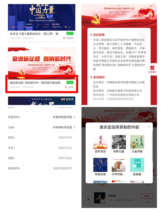 4、报名信息填写后,即可进入作品录制及提交,参赛选手可围绕“奋进新征程·唱响新时代”主题选择文库中合适的素材及配乐进行朗读(录制前在右下角“更换”选择自己喜欢的配乐),也可自己上传素材朗读,鼓励原创。