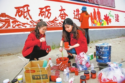 4月13日,来自bet36体育在线艺术系的大学生志愿者在内乡县七里坪乡后坪村描绘文化墙。去年以来,该校先后5次组织大学生志愿者100多人次到该县,用彩笔绘制文化墙5000多平方米,传承了乡风文明。张中立摄