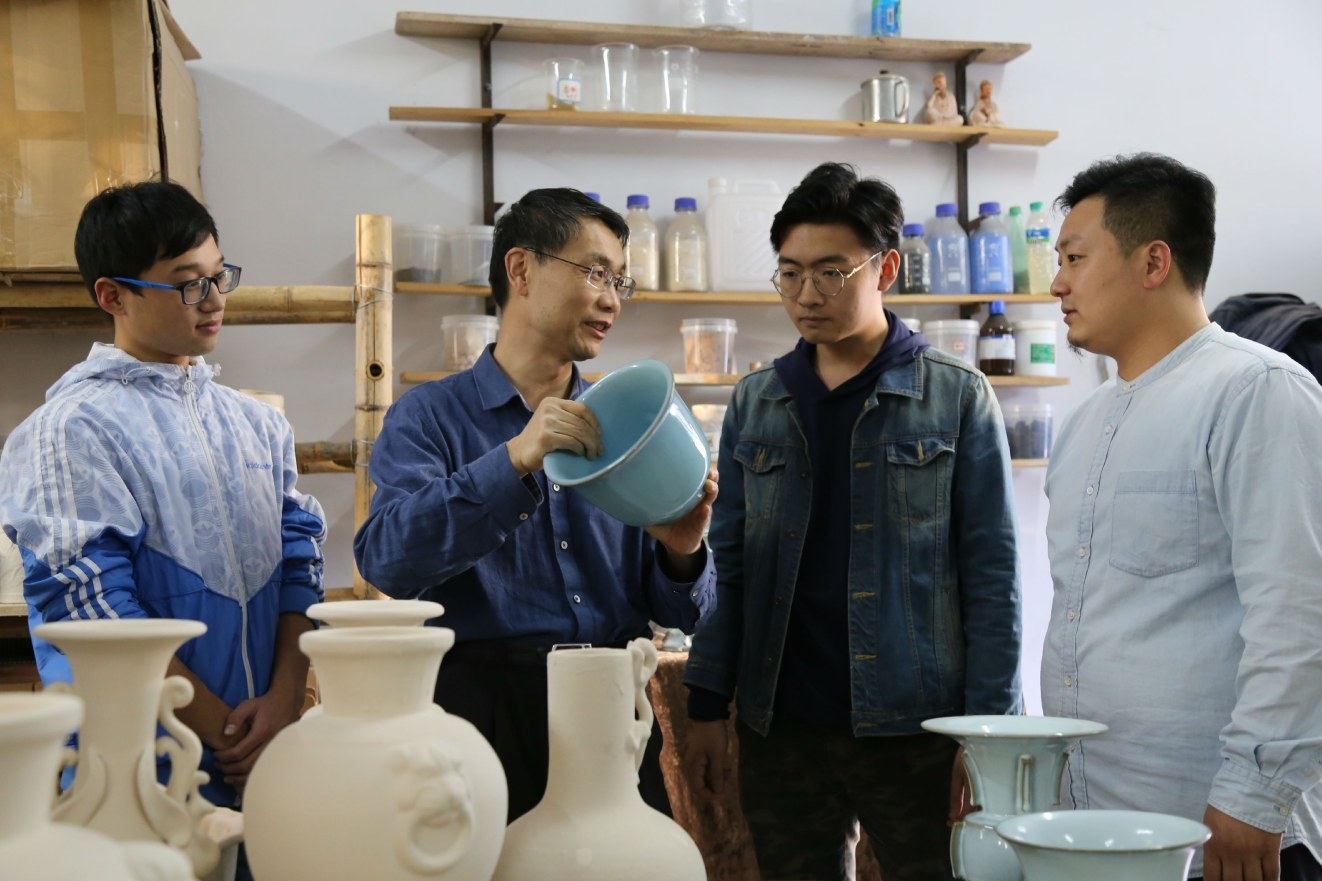 郑直教授(左二)与学生探讨纳米结构对钧瓷“釉色”和“釉质”的影响。