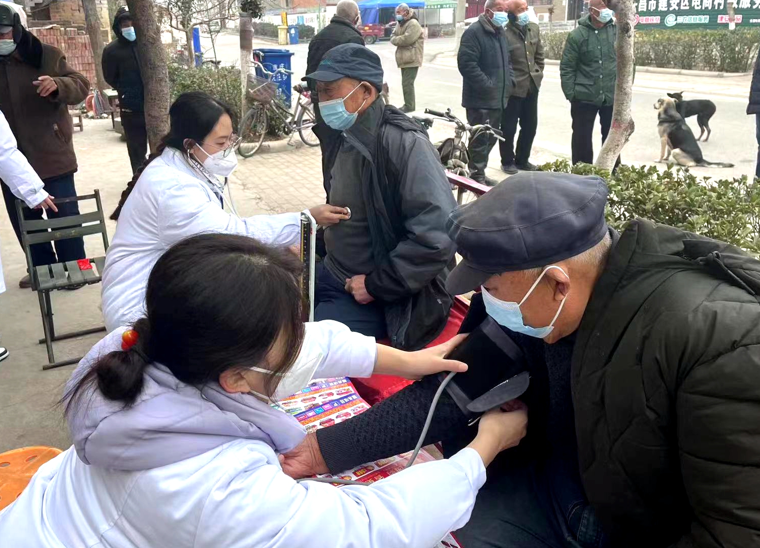 医学院2022级医学检验技术专业学生赵烁家住许昌,她与护理专业的陈胜楠、谭梦娟两位同学一起,报名加入了袁庄村医疗援助志愿服务队。