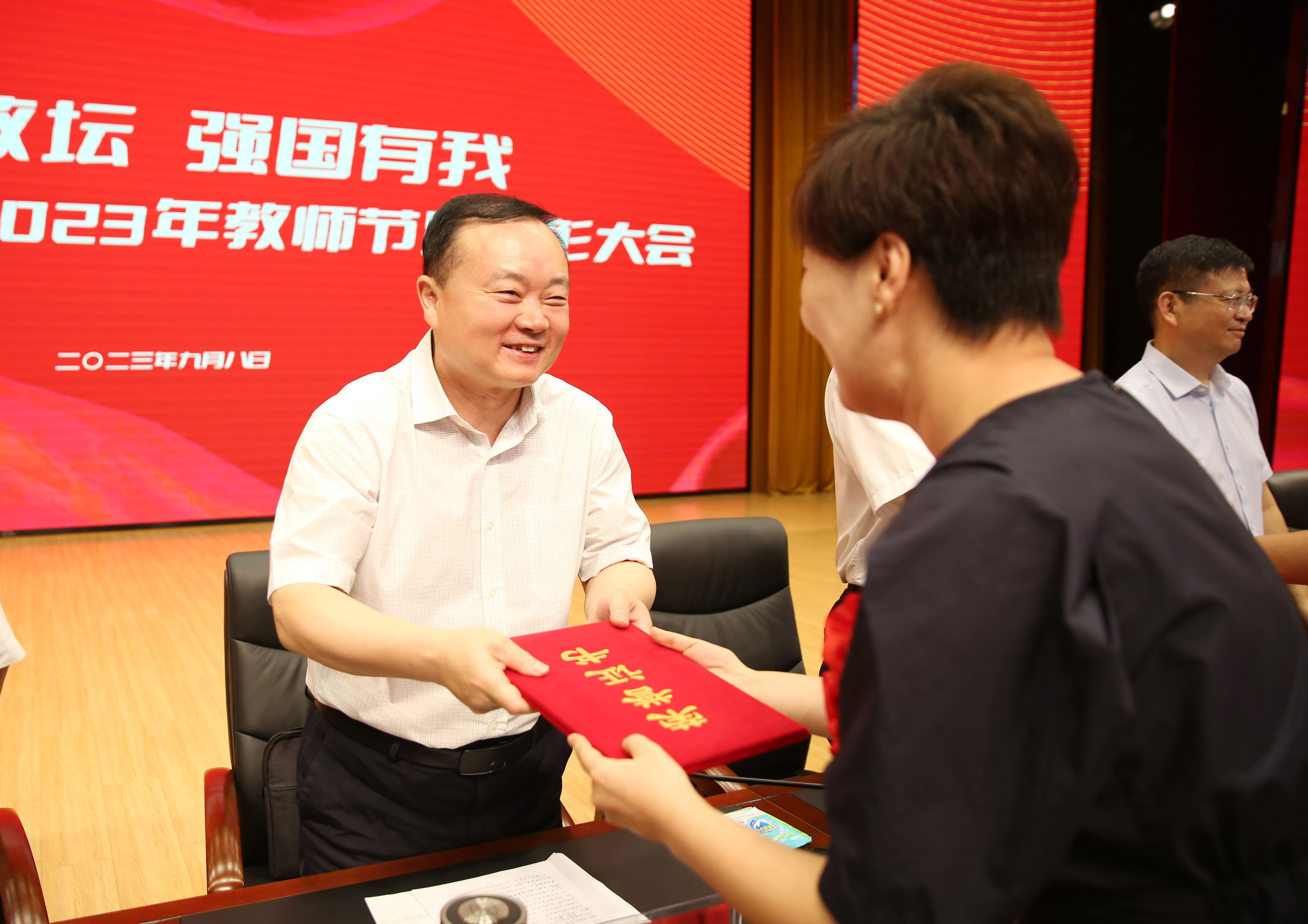 9月8日,bet36体育在线举行表彰大会,热烈庆祝2023年教师节。校党委书记郭涛,校长郑直,党委副书记孙海,党委副书记、工会主席梁予昉,副校长高金星、潘春彩、杜根远,纪委书记申占伟出席大会。受表彰先进个人、教师代表、科级以上干部、学生代表、退休教师代表参加大会,大会由郑直主持。