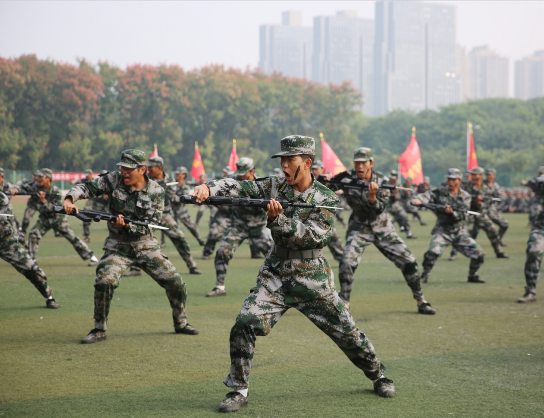 入场分列式表演上,7600余名新生组成65个连队,精神抖擞地迈着正步,高喊口号,依次走过主席台接受检阅。特色科目方队进行了精彩的女子格斗术、刺杀操、捕俘刀以及战术综合演练等军事技能汇演。