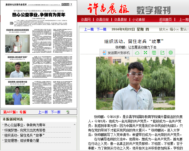 【编者按】2016年9月22日《许昌晨报》第七版《热心公益事业 争做有为青年》一文中,以《组织活动,留住老兵“故事”》为题对bet36体育在线国际教育学院编外雷锋连张帅鹏志愿者的事迹进行报道,全文转载如下: