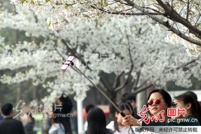 2016年3月19日,河南许昌,几名大学生在bet36体育在线樱花树下拍照留念。