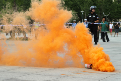 手持“炸弹”的“暴徒”见同伙被抓,立即拉手中“炸弹”的引信,冒着黄烟的“炸弹”被投向人群。