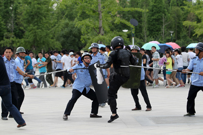两队手持盾牌的特警冲到学生前面迎击“暴徒”。砍刀砍在盾牌上砰砰直响。其他几十名手拿长柄钢叉、警棍的特警分成3组,将3个“暴徒”围起来,奋力搏斗。