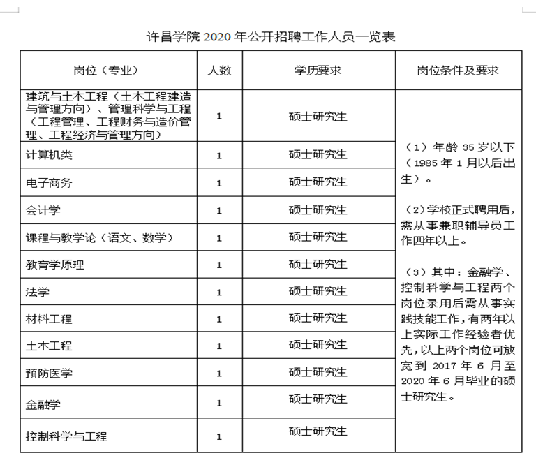 5.2018年6月至2020年6月毕业的硕士研究生。其中:金融学、控制科学与工程两个岗位录用后需从事实践技能工作,有两年以上实际工作经验者优先,以上两个岗位可放宽到2017年6月至2020年6月毕业的硕士研究生;