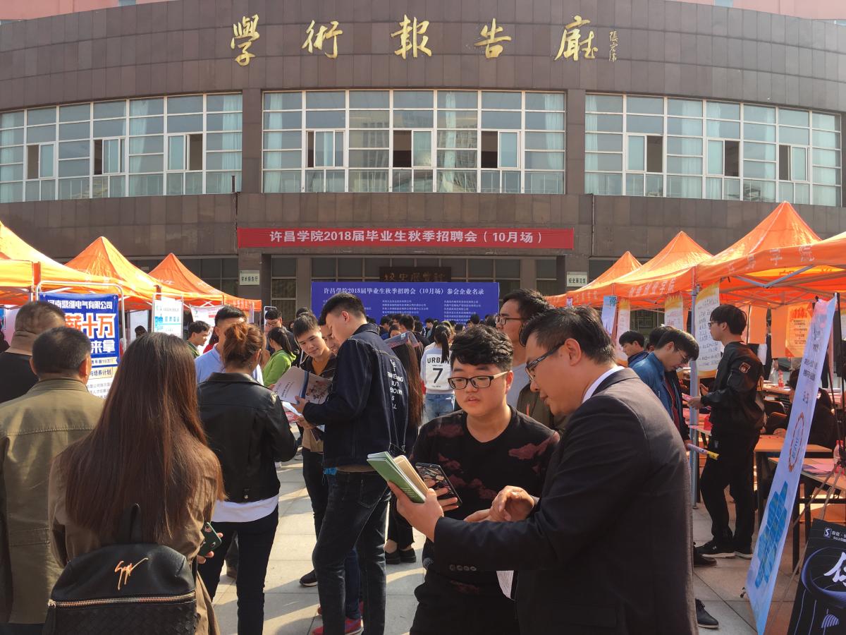 11月17日,由许昌市人力资源和社会保障局与bet36体育在线联合举办的许昌市2018届高校毕业生冬季双向选择洽谈会在bet36体育在线学术报告厅前广场举行。本次季洽谈会吸引河南黄河旋风股份有限公司、众品集团、河南瑞贝卡集团等200家企业到现场进行人才招聘,岗位需求涵盖本科及高职高专学历层次的各个专业4000多名毕业生进场求职。