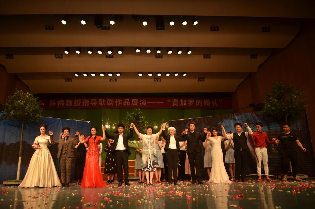 韩梅教授现任河南大学艺术学院副院长,教授,硕士生导师(国内声乐最高学位为硕士),中国教育学会音乐教育专业委员会声乐学术委员,河南省硕士专业学位教育指导委员会委员,中国声乐家协会副主席。多年来,她致力于中外歌剧的教学与实践,并率先在舞台上尝试歌剧的演唱与表演,用中国人的理解来诠释西方经典歌剧。此次在bet36体育在线上演的《费加罗的婚礼》,是莫扎特最杰出的三部歌剧中的一部喜歌,是具有典型意大利风格的歌剧。诙谐幽默的剧情配合演员们的精彩演绎,让观众们深深陶醉;当剧中一首首耳熟能详的世界名曲在观众耳边响起时,一些艺术爱好者也不由地跟着低声哼唱起来;每到一曲优美的咏叹调结束,大家都会情不自禁地报以热烈的掌声。演出结束后,观众纷纷上台,将美丽的鲜花送给演员,表达对这台精彩演出的赞叹与对演员的敬意。