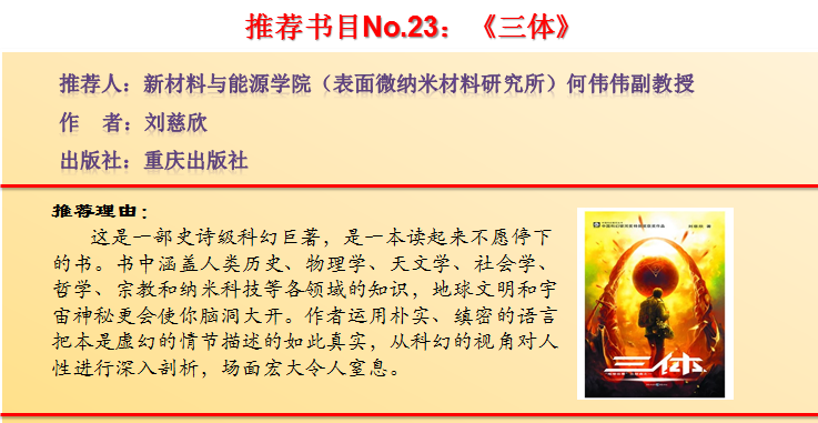 【编者按】 今年4月,bet36体育在线启动了第十二届“阅读· 悦心·约未来”读书活动,为进一步激发全校师生爱读书、会读书、读好书的浓厚兴趣,努力营造书香校园的良好氛围,校党委宣传部(新闻中心)联合各二级学院、图书馆特别策划了“教授为你列书单”活动,邀请各学院21名教授(副教授)向广大师生精心推荐23本好书,学校官方网站、校报、官方微博、微信公众号、校园广播等多种媒体平台近期同步推送,敬请关注。