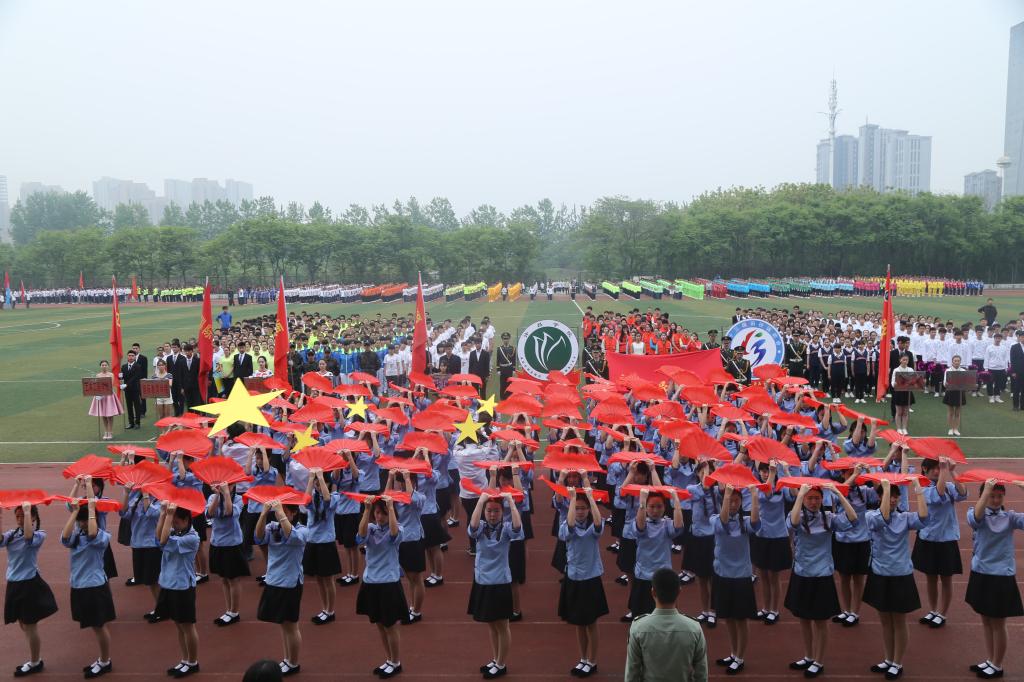 上午8时,伴随着雄壮激越的《运动员进行曲》,全体裁判员、运动员在校旗、运动会会徽和彩旗方队的引导下入场。