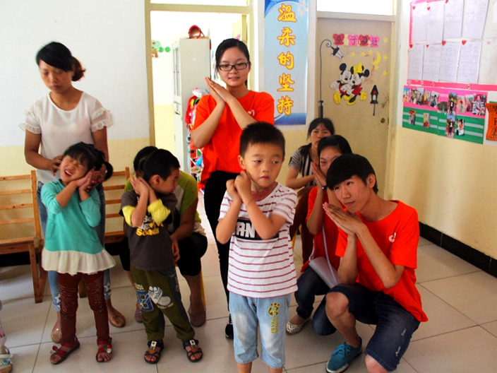 指导下,对孩子们进行动作协调、体肌张力等方面的训练,帮助孩子们学习如何完成指定任务。同时,队员们在对孩子们进行康复训练之余,还教孩子们识字,认数,简单的手工制作,与孩子们一起唱儿歌、做游戏。孩子们热情高涨,队员们认真负责,大家其乐融融。