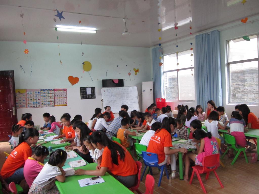 资力量比较薄弱。鉴于此种情况,队员们在杨老师的指导下,详细了解了孩子们的学习现状,重点围绕孩子们学习过的知识点和即将学习的新知识,制定了支教计划和教学大纲,一丝不苟地向孩子们传授知识。听着朗朗的读书声,看着一双双真挚而充满求知欲的眼睛,每个队员的心都在悄然融化,这种让人无法用言语来形容的莫名情愫已经急速迅猛的侵蚀着队员们的心。一定要给这些孩子最温暖的爱,成了队员们心照不宣的目标。