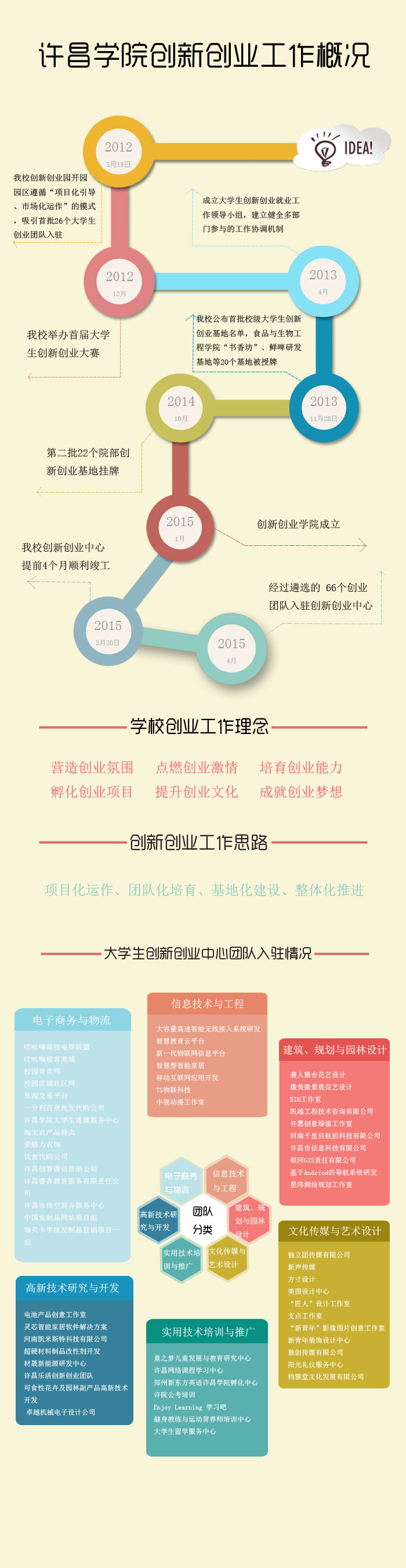 2013年学校成立大学生创新创业就业工作领导小组,建立健全了教学、科研、学生、团委、就业和教学院部等参加的创新创业工作协调机制,2015年初又成立了创新创业学院。