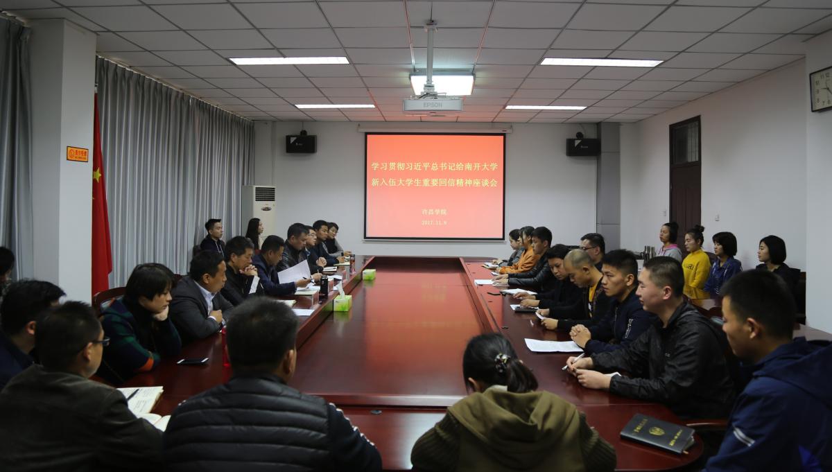 11月9日上午,bet36体育在线在办公楼第四会议室召开了学习贯彻习近平总书记给南开大学新生入伍大学生重要回信精神座谈会。校党委副书记孙海出席会议,党委宣传部、学生工作部和武装部等相关部门负责人、各二级学院学生工作负责人代表和全体退伍学生共50余人参加座谈。座谈会由学生工作部部长张鹏辉主持。
