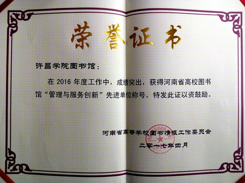 近日,在河南省高校图书馆2017年工作会议上,bet36体育在线图书馆荣获2016年度河南省高校图书馆“管理与服务创新”先进集体称号。