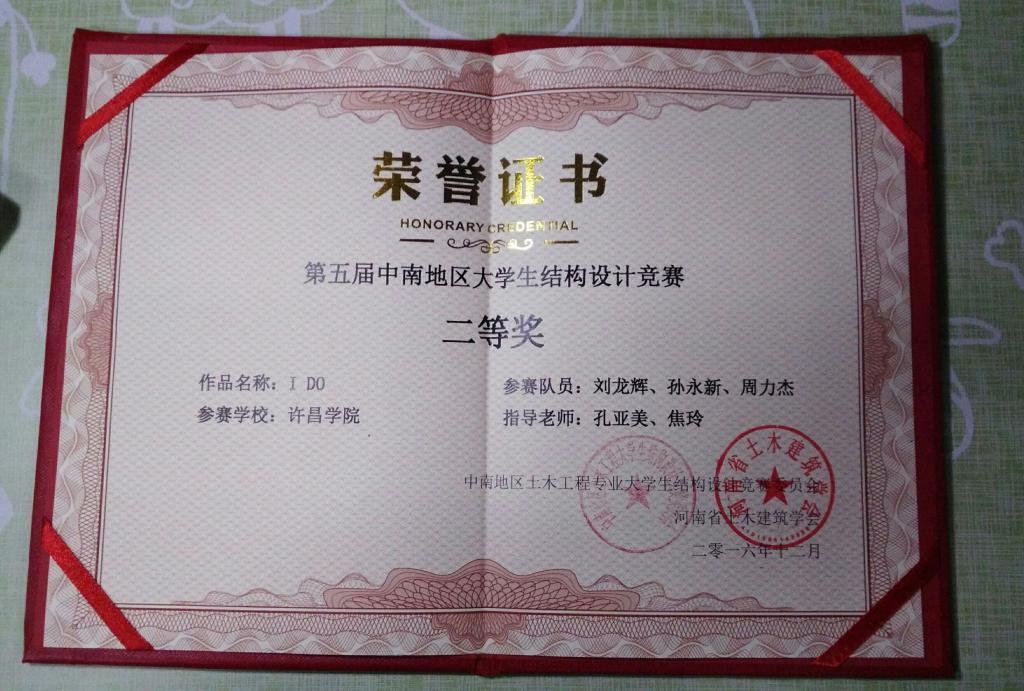 12月8日-10日,由中南地区土木工程专业大学生结构设计竞赛委员会和河南省土木建筑学会主办的第五届中南地区大学生结构设计竞赛在郑州大学落下帷幕。bet36体育在线土木工程学院孔亚美等老师指导,周力杰、刘龙辉、孙永新同学组成的代表队与来自华南理工大学、长沙理工大学、广西大学等中南七省40多所高校的45支队伍展开角逐,最终以总分第十名荣获大赛二等奖。