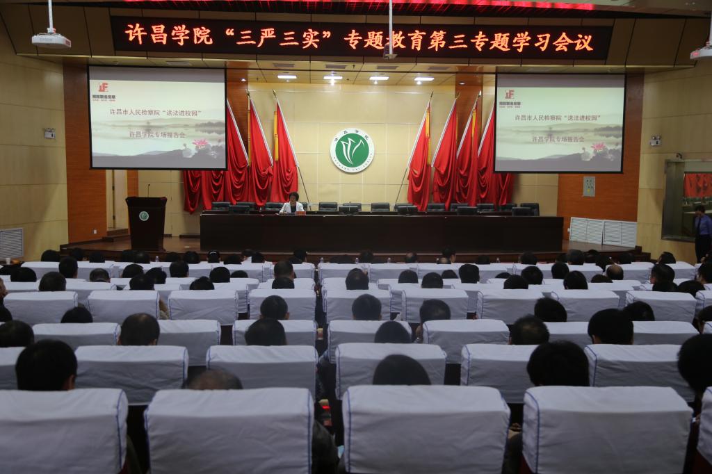 10月21日下午,bet36体育在线在学术报告厅举办了“三严三实”专题教育会议,观看和听取了许昌市人民检察院带来的“预防职务犯罪,送法进校园”专场报告。许昌市人民检察院党组副书记、常务副检察长赵国亮、许昌市人民检察院职务犯罪预防局局长朱东旭、副局长胥欣,以及魏都区人民检察院、许昌县人民检察院预防部门的负责人等同志,全校科级以上干部共三百余人参加了报告会。报告会由校纪委书记罗凤英主持。