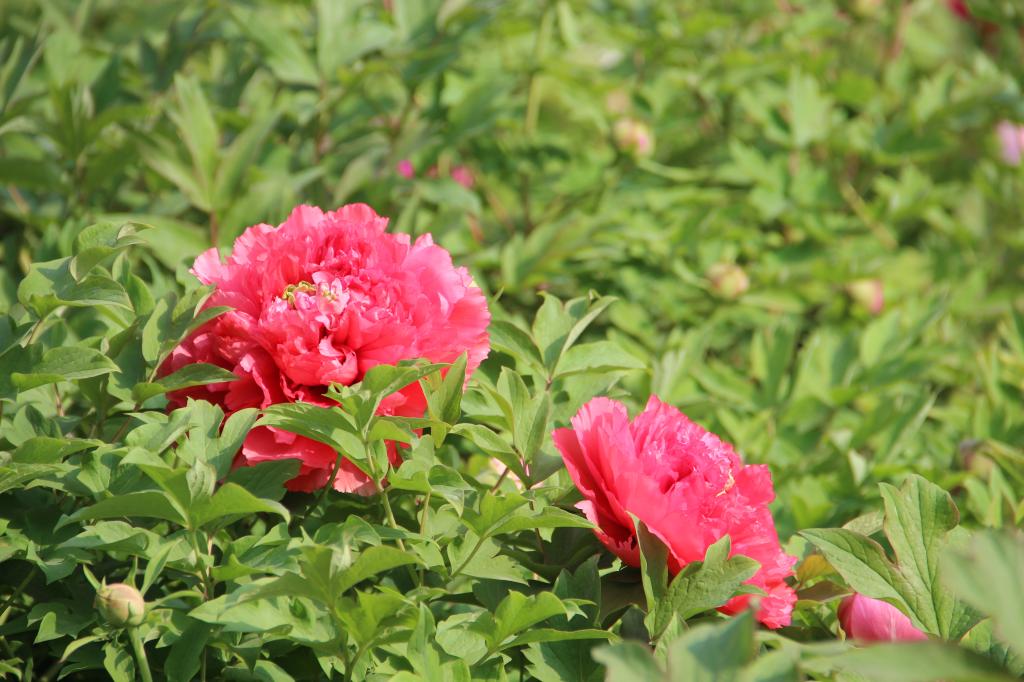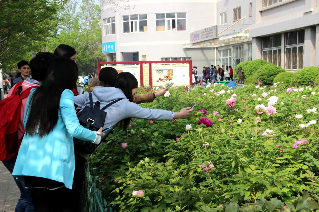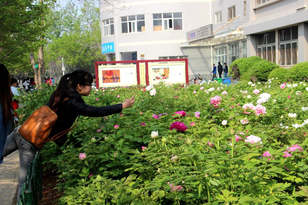 据了解,位于东西启智楼前的牡丹分别栽种于2006年和2014年,各1100余株,有状元红、紫薇、赵粉等十几个品种,目前陆续进入盛开期。