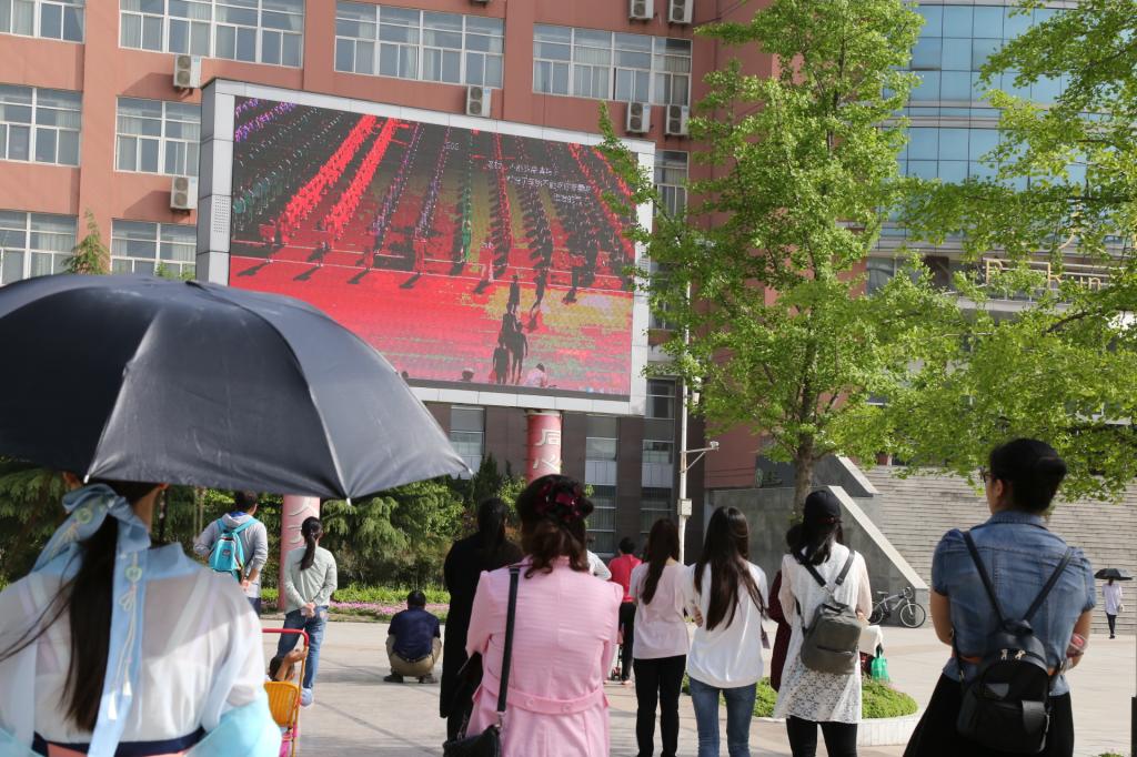 在网络直播的同时,学校弘毅广场、羽飞田径场外大屏幕也进行了同步直播,吸引了众多师生围观。