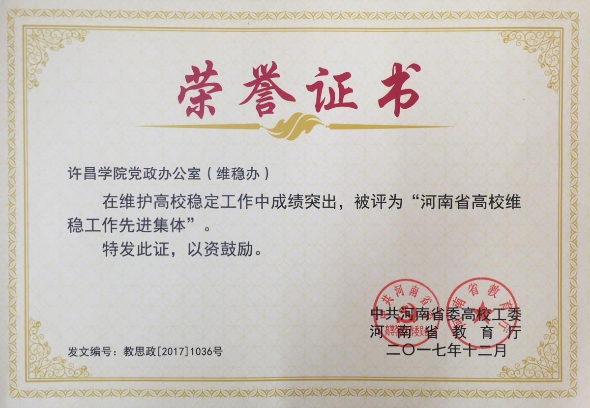 近日,河南省委高校工委、河南省教育厅联合下发《中共河南省委高校工委 河南省教育厅关于表彰全省高校维稳工作先进集体和先进个人的通知》,bet36体育在线党政办公室(维稳办)荣获“河南省高校维稳工作先进集体”荣誉称号,党委保卫部张谦智,党政办公室(维稳办)崔越、王光星获得“河南省高校维稳工作先进个人”荣誉称号。