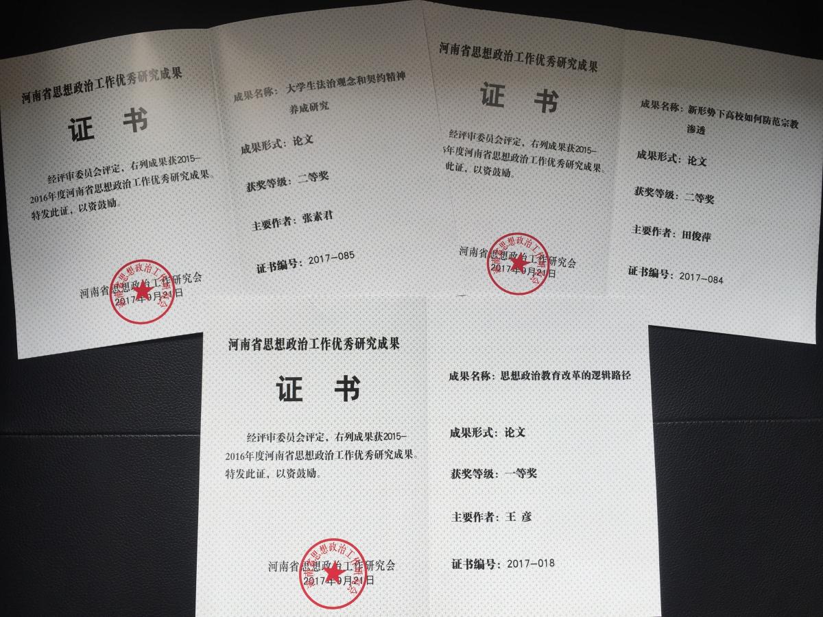 近日,河南省2015—2016年度思想政治工作优秀研究成果评选结果揭晓,bet36体育在线荣获省级一等奖1项,省级二等奖2项。