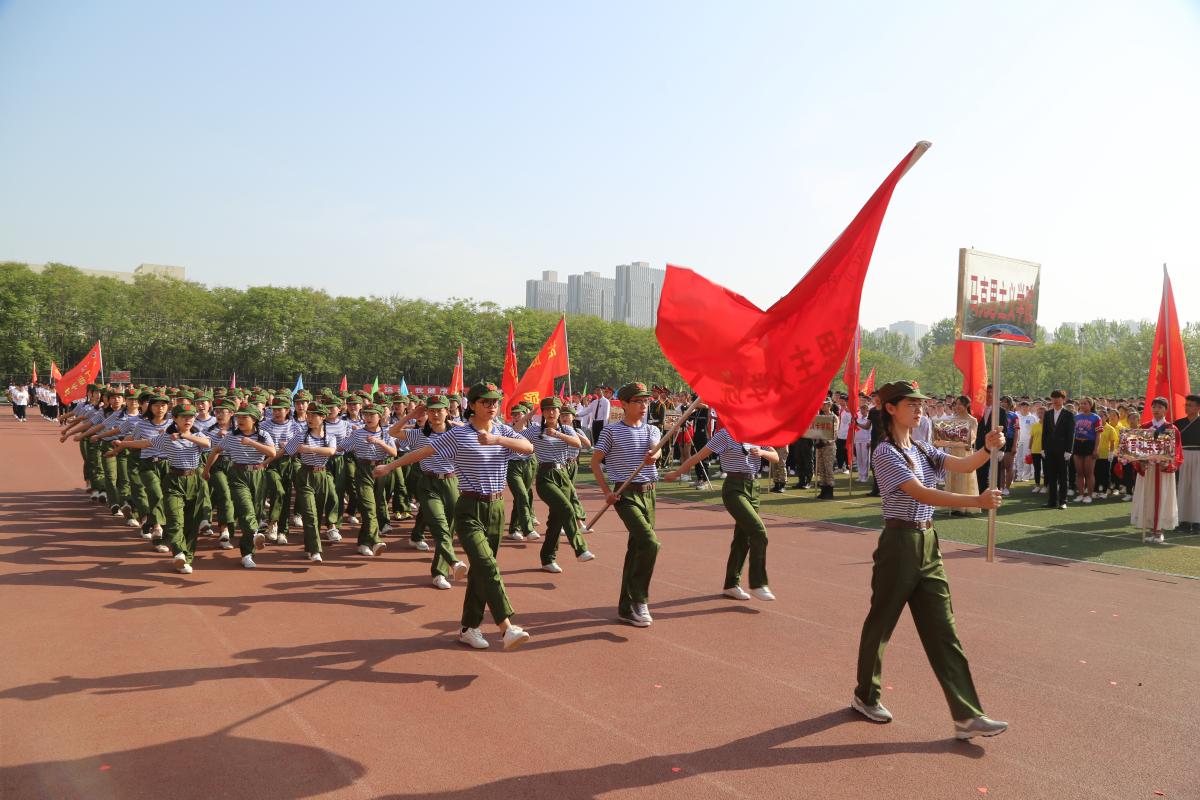 上午8时,伴随着雄壮激越的《运动员进行曲》,全体裁判员、运动员在校旗、运动会会徽和彩旗方队的引导下入场。