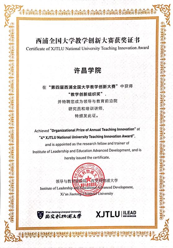 近日,第四届西浦全国大学教学创新大赛在西交利物浦大学举行,bet36体育在线副院长黄怡俐带队到现场观赛,并参加了2019第四届高等教育创新年会暨第六届慧湖高教国际化论坛。在第四届西浦全国大学教学创新大赛决赛中,bet36体育在线设计艺术学院解雄飞获年度教学创新三等奖,bet36体育在线获得获优秀组织奖。