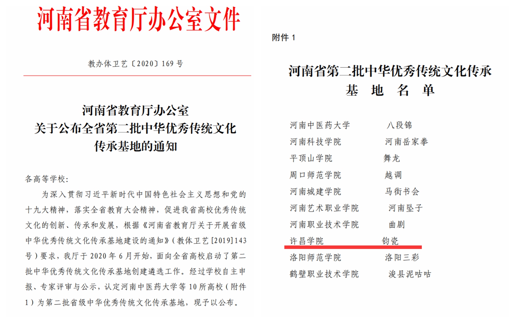 近日,河南省教育厅发布了《关于公布全省第二批中华优秀传统文化传承基地的通知》(教办体卫艺〔2020〕169号),bet36体育在线申报的“钧瓷”获批河南省第二批中华优秀传统文化传承基地。