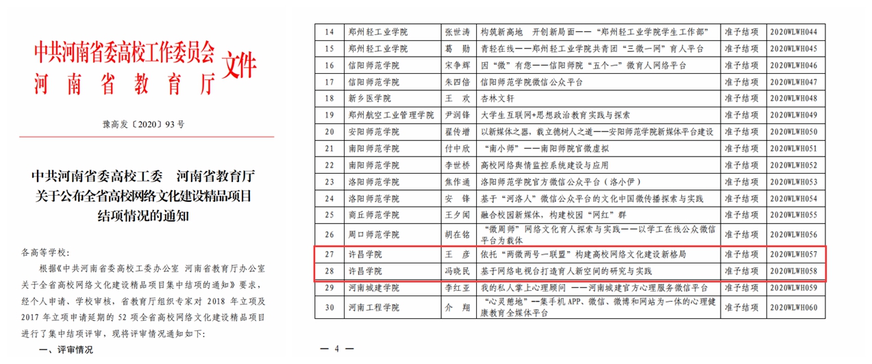 近日,中共河南省委高校工委、河南省教育厅下发了《关于公布全省高校网络文化建设精品项目结项情况的通知》(豫高发〔2020〕93 号),省教育厅组织专家对 2018 年立项及2017 年立项申请延期的 52 项全省高校网络文化建设精品项目进行了集中结项评审。由bet36体育在线冯晓民、王彦为负责人的《基于网络电视台打造育人新空间的研究与实践》《依托“两微两号一联盟”构建高校网络文化建设新格局》两项全省高校网络文化建设精品项目顺利结项。
