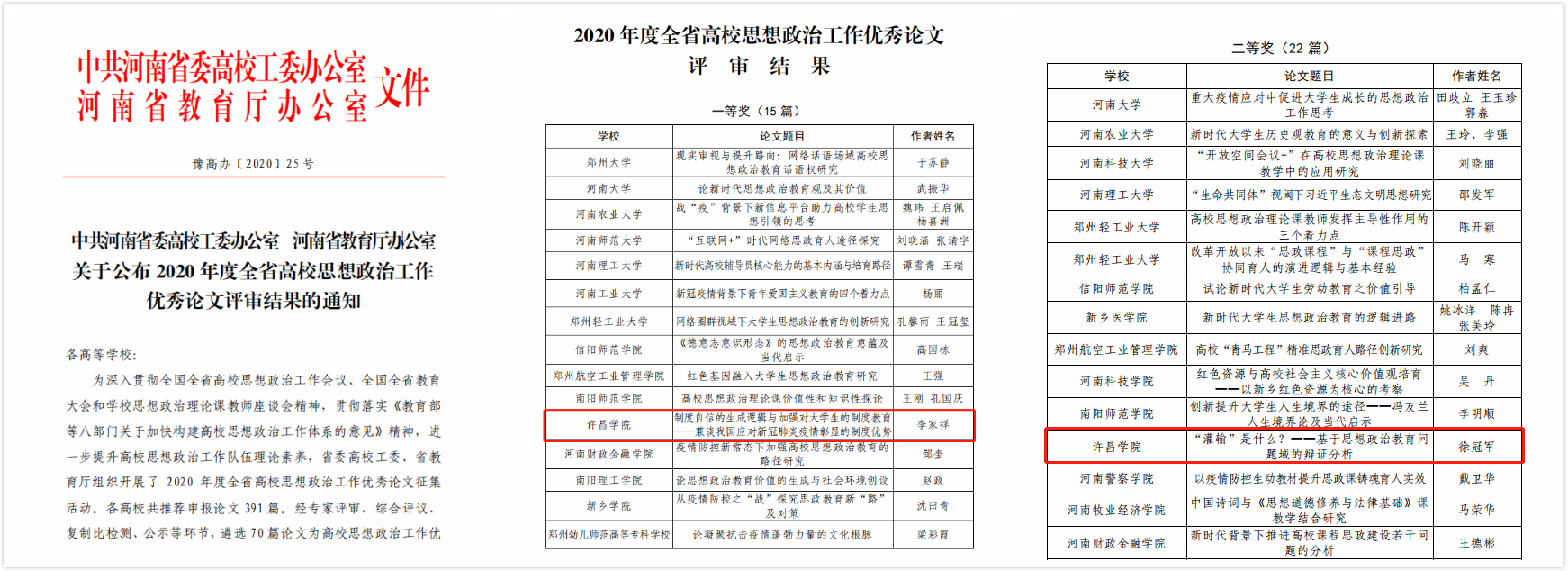 近日,中共河南省委高校工委、河南省教育厅下发《关于公布2020年度全省高校思想政治工作优秀论文评审结果的通知》。bet36体育在线马克思主义学院教师李家祥撰写的《制度自信的生成逻辑与加强对大学生的制度教育——兼谈我国应对新冠肺炎疫情彰显的制度优势》荣获一等奖, 马克思主义学院教师徐冠军撰写的《“灌输”是什么?——基于思想政治教育问题域的辩证分析》荣获二等奖。