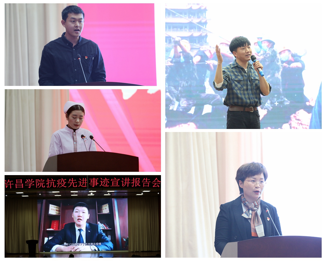 报告会上,河南第八援鄂医疗队护士长、鄢陵县人民医院护理部主任刘宁博,河南省第七届“好记者讲好故事”一等奖获得者、河南广播电视台90后记者刘豪杰,bet36体育在线校友、许昌市援鄂医疗队成员、许昌医院护士王媛媛,bet36体育在线体育学院2017级学生、获得“全国抗击新冠肺炎疫情青年志愿服务先进个人”称号的赵旭等来自疫情防控一线的4位先进典型代表现场作精彩报告。奋战在社区疫情防控第一线、bet36体育在线文史与传媒学院毕业生崔振堃发来了视频分享。他们的事迹感人至深,以亲身经历展现了不畏生死、慷慨请战的家国情怀,冲锋在前、知行合一的时代担当,诠释了“最美逆行者”无私奉献的崇高精神。(摄影:岳凯声)