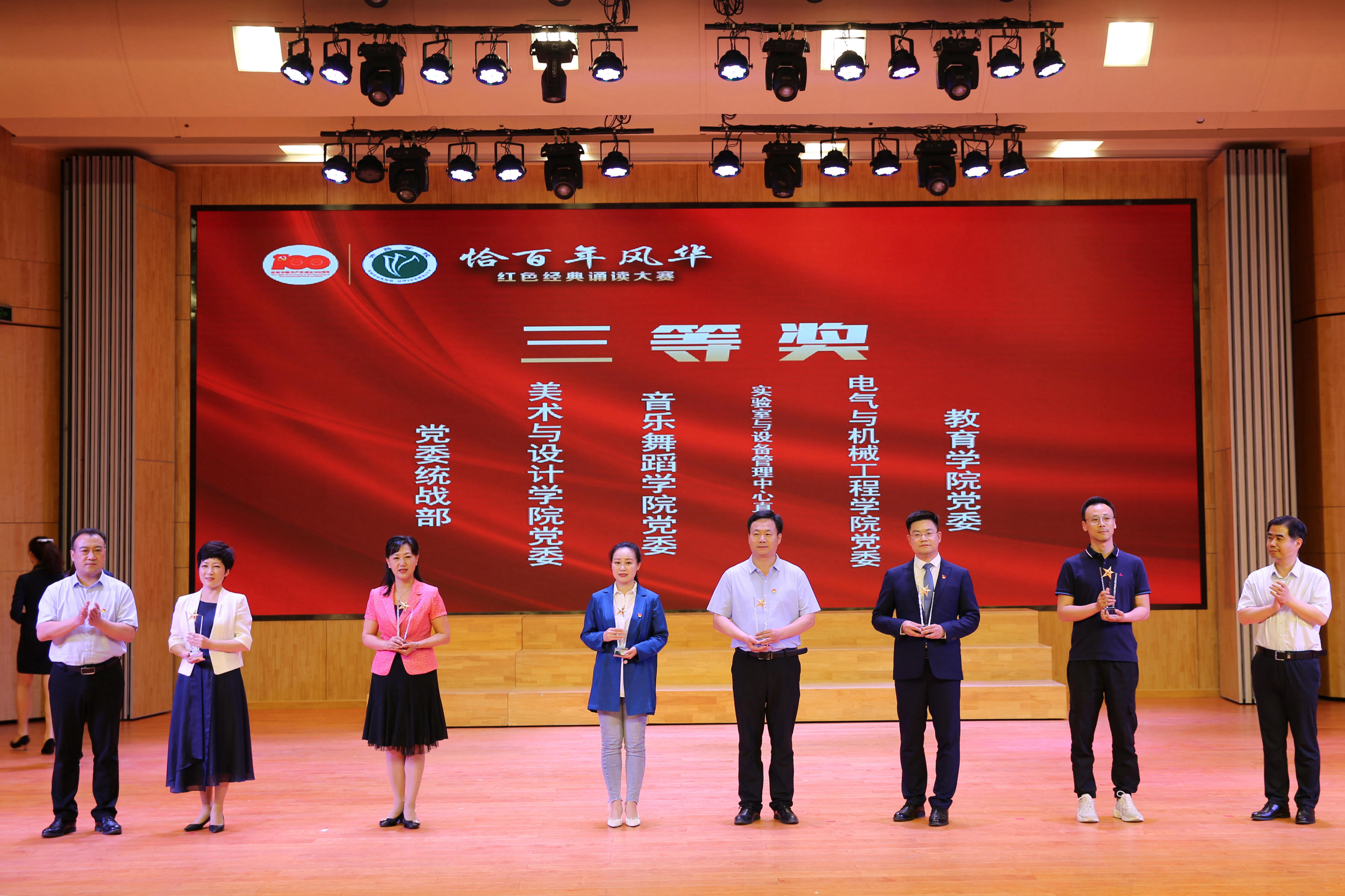 本次大赛分为初赛征集和决赛展演两个环节。活动自4月份启动以来,各基层党委、直属党支部积极参与,共上报作品23部。经过专家评审,最终11部作品脱颖而出进入决赛。决赛现场,参赛节目精彩纷呈,选手们以其铿锵有力的气势、声情并茂的朗诵,赢得在场师生的阵阵掌声。其中,机关党委朗诵作品《百年党史》,带领大家重温了中国共产党100年的光辉历程;国际教育学院党委朗诵作品《英雄赞歌》,将朗诵和舞蹈表演完美融合;马克思主义学院党委朗诵作品《我是共产党员,我没有忘记》,让现场观众更加坚定了知党恩、跟党走的信心和决心;后勤管理服务中心党委带来的作品《我骄傲,我是中国人》,句句洋溢着浓浓的民族情、中国魂,表达了作为一个中国人的骄傲与自豪。由党委统战部选送,民盟bet36体育在线支部主委田萍、九三学社许昌东城二支社主委张少华、农工党许昌支部副主委郑晓冬、无党派代表人士贾晓红等10名党外人士共同朗诵的节目《有一首歌》,热情讴歌了中国共产党领导中国革命、建设和改革开放事业取得的伟大成就,回顾中国共产党与统一战线各界人士风雨同舟的光辉历程,表达在中国共产党领导下为全面建成小康社会,实现中华民族伟大复兴而团结奋斗的良好愿望。