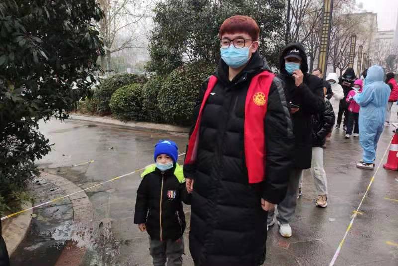 在郑州市航海东路社区金地铂悦检测点,有一个场景令人动容。一个身高一米八多的男生拉着一个小朋友走在队伍的前列,对比十分强烈,原来是小朋友害怕核酸采样,这位身穿红马甲的志愿者就像大哥哥一样拉起小朋友的手,鼓励他:“张开嘴‘啊’一下,一点都不疼。”在他的陪伴下,小朋友顺利完成了采样。这个高高大大的男生,就是文史与传媒学院2021级学生吴家昊。