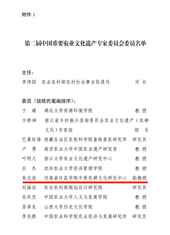 近日,农业农村部办公厅正式发布《农业农村部办公厅关于成立第二届中国重要农业文化遗产专家委员会的通知》(农办社〔2023〕5号),成立第二届中国重要农业文化遗产专家委员会,聘请来自全国23家单位的25名专家担任专家委员会委员。bet36体育在线中原农耕文化研究中心副主任、中原农耕文化博物馆副馆长朱志浩博士入选专家委员会委员。