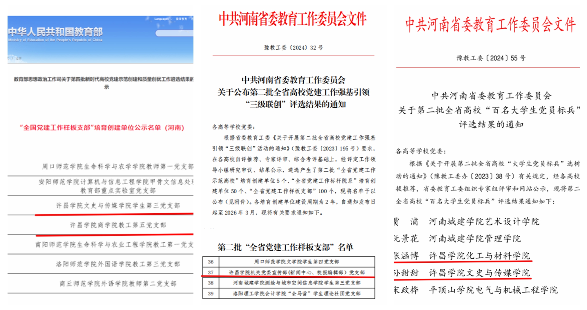 其中,商学院教工第五党支部、文史与传媒学院学生第三党支部成功获批教育部第四批“全国党建工作样板支部”培育创建单位;机关党委宣传部(新闻中心、校报编辑部)党支部获批第二批“全省党建工作样板支部”;化工与材料学院学生张涵博、文史与传媒学院学生孙甜甜获评第二批全省高校“百名大学生党员标兵”。