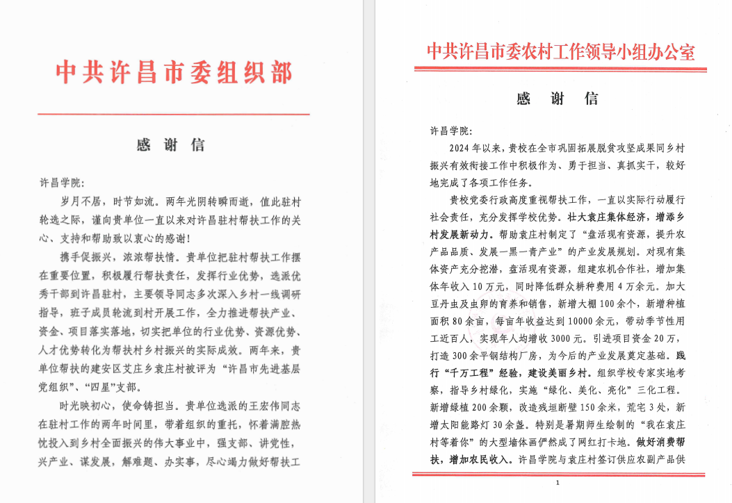 近日,许昌市委组织部和许昌市委农村工作领导小组办公室向bet36体育在线发来感谢信,对bet36体育在线积极开展驻村帮扶,在巩固拓展脱贫攻坚成果同乡村振兴有效衔接工作中所做出的努力和贡献表示衷心的感谢。