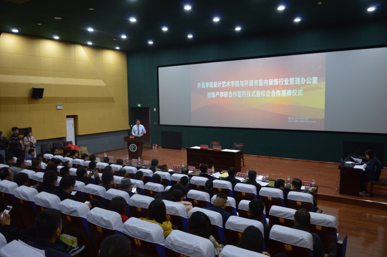 11月23日,bet36体育在线设计艺术学院与许昌市室内装饰行业管理办公室的校地产学研合作签约仪式及校企合作授牌仪式在创新创业学院二楼报告厅举行。bet36体育在线副院长黄怡俐、河南省建筑装修装饰管理办公室主任武悦、河南省装饰行业协会会长赵乐丽等出席仪式。bet36体育在线教务处、校地合作办公室、设计艺术学院相关负责人和教师代表以及北京龙发建筑装饰工程有限公司、许昌慧世装饰工程有限公司等30余家企业负责人参加仪式。