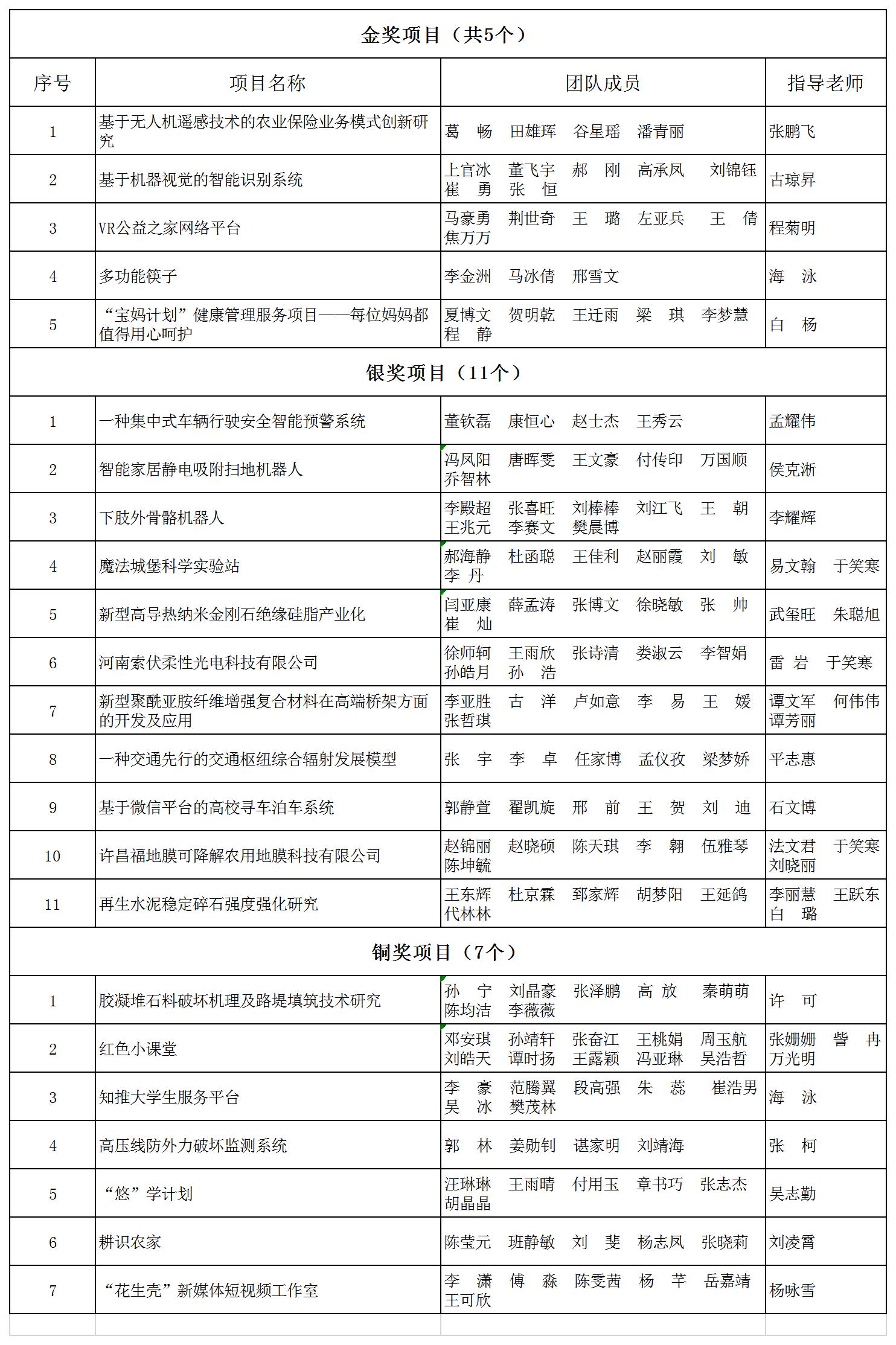 城市与环境学院《基于无人机遥感技术的农业保险业务模式创新研究》等5项作品获金奖,信息工程学院《一种集中式车辆行驶安全智能预警系统》等11项作品获银奖,土木工程学院《胶凝堆石料破坏机理及路堤填筑技术研究》等7项作品获铜奖,张鹏飞等5名教师获评优秀指导教师。