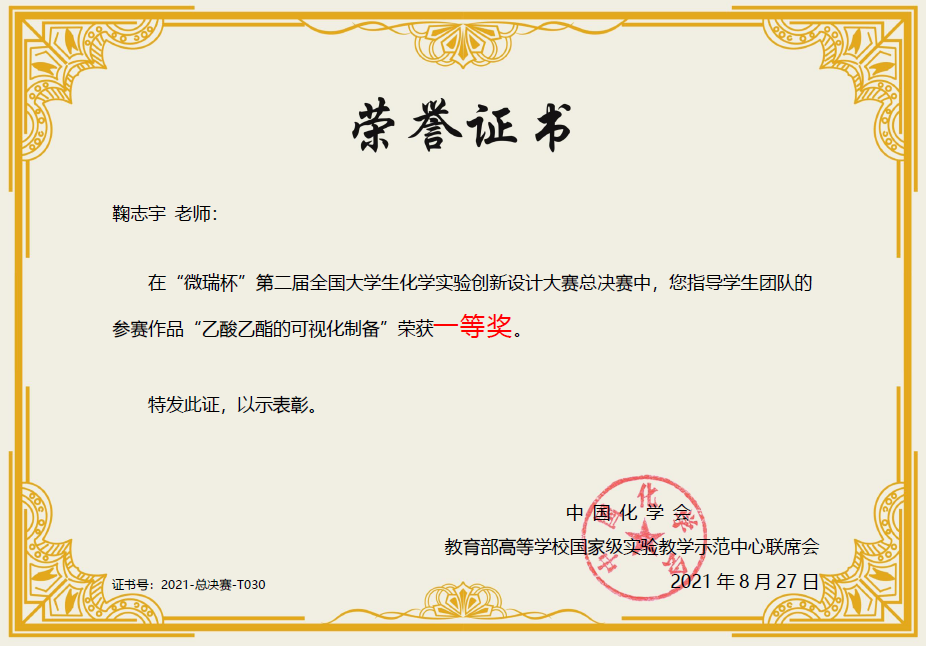 8月25日至27日,“微瑞杯”第二届全国大学生化学实验创新设计竞全国总决赛在青岛举行。全国7个赛区共有90所高校代表队晋级总决赛,bet36体育在线化工与材料学院鞠志宇老师担任指导教师,2018级本科生赵书珍、孔灵钰、杨莹莹组成的“显而易见”代表队,荣获总决赛一等奖。这是bet36体育在线学生在国家级学科竞赛中的又一次突破。