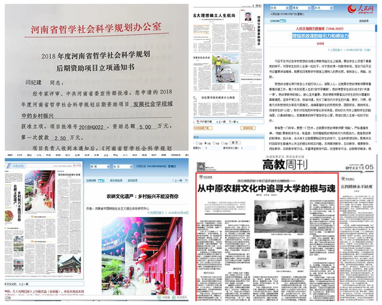 今年8月,基地科研团队以“中原农耕文化与乡村发展研究”为主题,获批“河南省高等学校哲学社会科学创新团队”立项,实现了bet36体育在线省级哲学社会科学创新团队零的突破,获得研究经费资助40万元。该立项对bet36体育在线哲学社会科学领域研究团队进一步有机整合、凝练研究特色,提升bet36体育在线哲学社会科学科研创新力、影响力有着重要意义。团队成员全力投入科研工作,陆续在权威期刊发表论文3篇,出版学术专著5部,获得国家级、省级课题立项6项。